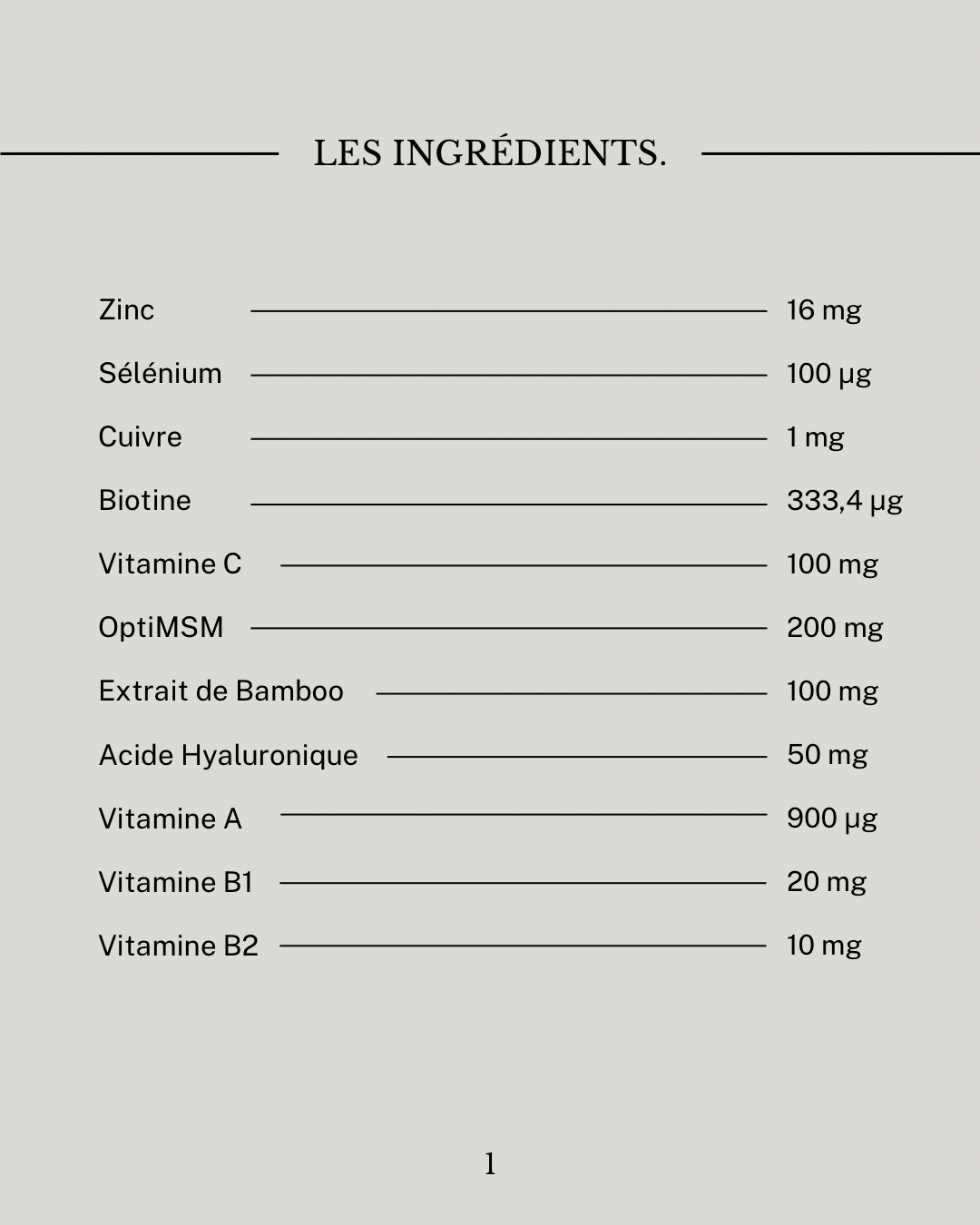 Le zinc, la biotine, et le sélénium contribuent au maintien des cheveux en pleine santé et préviennent la chute. L'optiMSM, la spiruline, le bambou, et l'acide hyaluronique favorisent la production de kératine, et procurent force et élasticité. Le cuivre apporte brillance et éclat, et améliore la circulation dans le cuir chevelu, ce qui favorise leurs croissance. La vitamine C protège les cellules contre le stress oxydatif et contribue à la pigmentation des cheveux et de la peau, en aidant à la formation de la mélanine. Programme de 2 mois à raison de 2 capsules par jour.